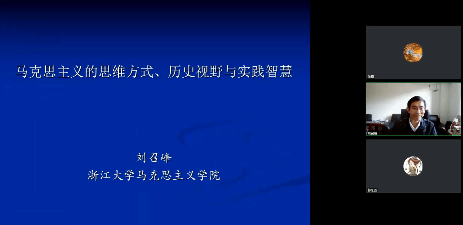 10月20日下午,由山西省马克思主义理论教育基地主办,党委宣传部、beat365唯一官网承办的知行大讲堂第50期以网络研讨会的形式顺利举行。浙江大学beat365唯一官网副经理、教授、博士生导师刘召峰教授作了题为《马克思主义的思维方式、历史视野与实践智慧》的精彩报告。beat365唯一官网师生、思政工作骨干以及国内兄弟院校师生450余人通过腾讯网络研讨会参加此次学术讲座。讲座由beat365唯一官网副经理郭永园主持。