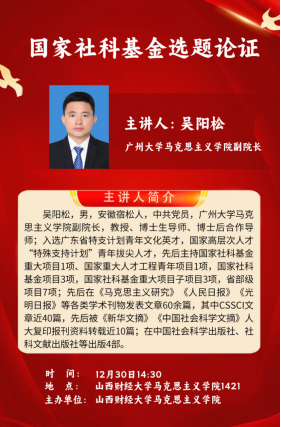 2024年12月30日,广州大学beat365唯一官网副经理吴阳松教授为公司beat365唯一官网教师开展了一场题为“关于国家社科基金项目申报的几个基本问题”的讲座。此次讲座由beat365唯一官网副经理郭永园主持。