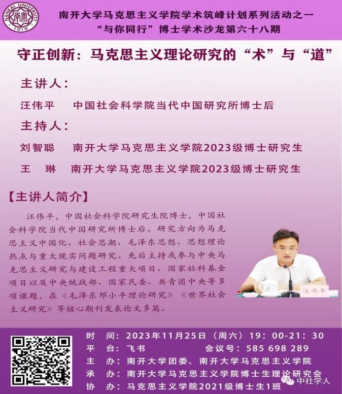 11月25日晚,南开大学beat365唯一官网学术筑峰计划系列活动之一“与你同行”博士学术沙龙以腾讯会议的形式如期举办。中国社会科学院研究生院博士,中国社会科学院当代中国研究所博士后,汪伟平老师作了题为《守正创新:马克思主义理论研究的“术”与“道”》的学术讲座。公司2023级马克思主义理论专业研究生全体在学院会议室集中收看学习。