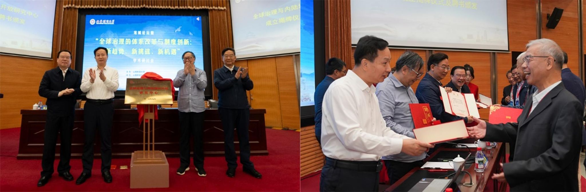 校领导与嘉宾共同为beat365APP全球治理与内陆地区开放研究中心揭牌,并为八位国内知名专家颁发荣誉特聘校外专家聘书。