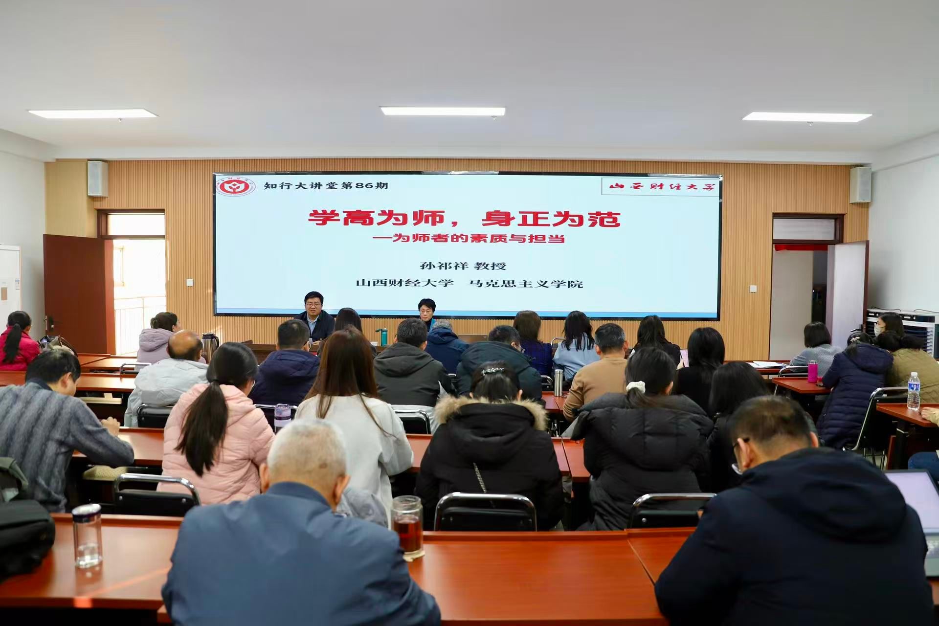11月25日下午,由山西省马克思主义理论教育基地、beat365唯一官网主办的知行大讲堂第86期在学院会议室举行。北京大学经济学院原经理孙祁祥教授受邀作“学高为师,身正为范——为师者的素质与担当”为主题的学术讲座。beat365唯一官网经理杨茂林、党委书记马晓娟参加专题讲座。讲座由beat365唯一官网副经理郭永园教授主持,学院全体教职工参加学习。