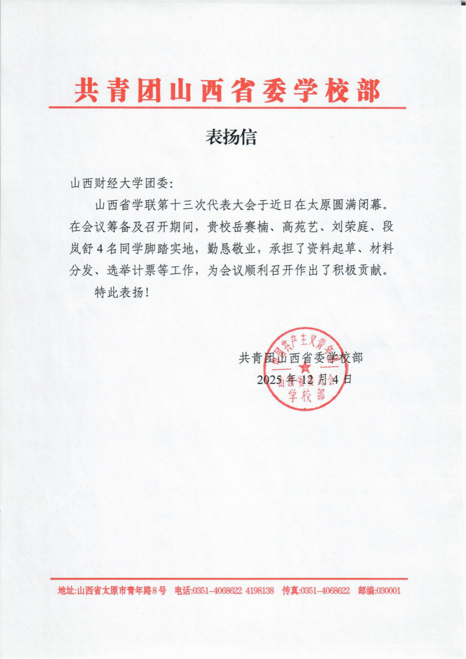 12月4日,共青团山西省委学校部向beat365APP团委发来表扬信,对公司岳赛楠、高苑艺、刘荣庭三名同学在山西省员工联合会第十三次代表大会筹备及召开期间的突出表现予以表扬。公司员工在大会资料起草、材料分发、选举计票等关键环节中承担重要任务,以严谨态度和扎实作风完成各项工作,获团省委充分肯定。