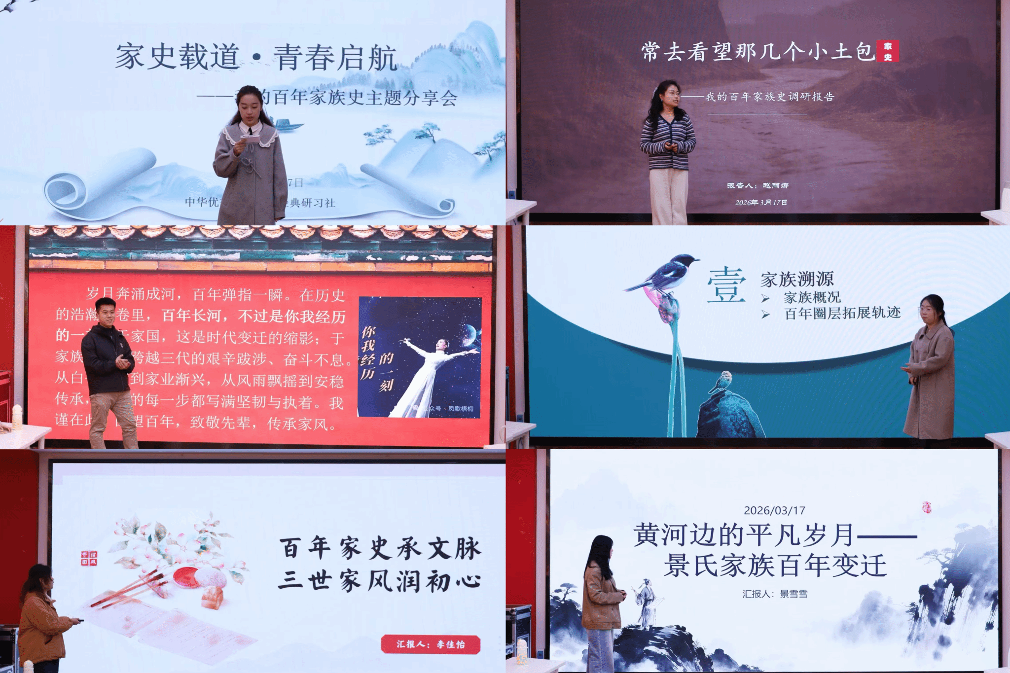 在分享环节,五位同学结合调研成果,以独特视角讲述家族百年变迁。冯雨同学以“家族娘子军”为题,讲述了家族女性成员在不同历史时期的奋斗事迹,展现家族女性坚韧担当、乐观向上的精神力量。李佳怡同学通过展现家族三代人的职业转型与生活条件的时代变迁,传递“踏实守初心”的家训内涵。姚鹏宁同学则以一把木质算盘为核心线索,回顾家族的发展历程,诠释“守正笃行,诚信立身”的家风传承。景雪雪同学从平凡生活角度讲述家族迁徙与父辈职业历程,以农耕锄头、进货账本等老物件,展现“忠厚勤俭”的家风。而赵丽娜同学以祭祖活动为切入点,结合平定县志考证与母亲口述,梳理家族迁徙脉络,提炼出“坚韧诚恳、仁义担当”的家族品质。
