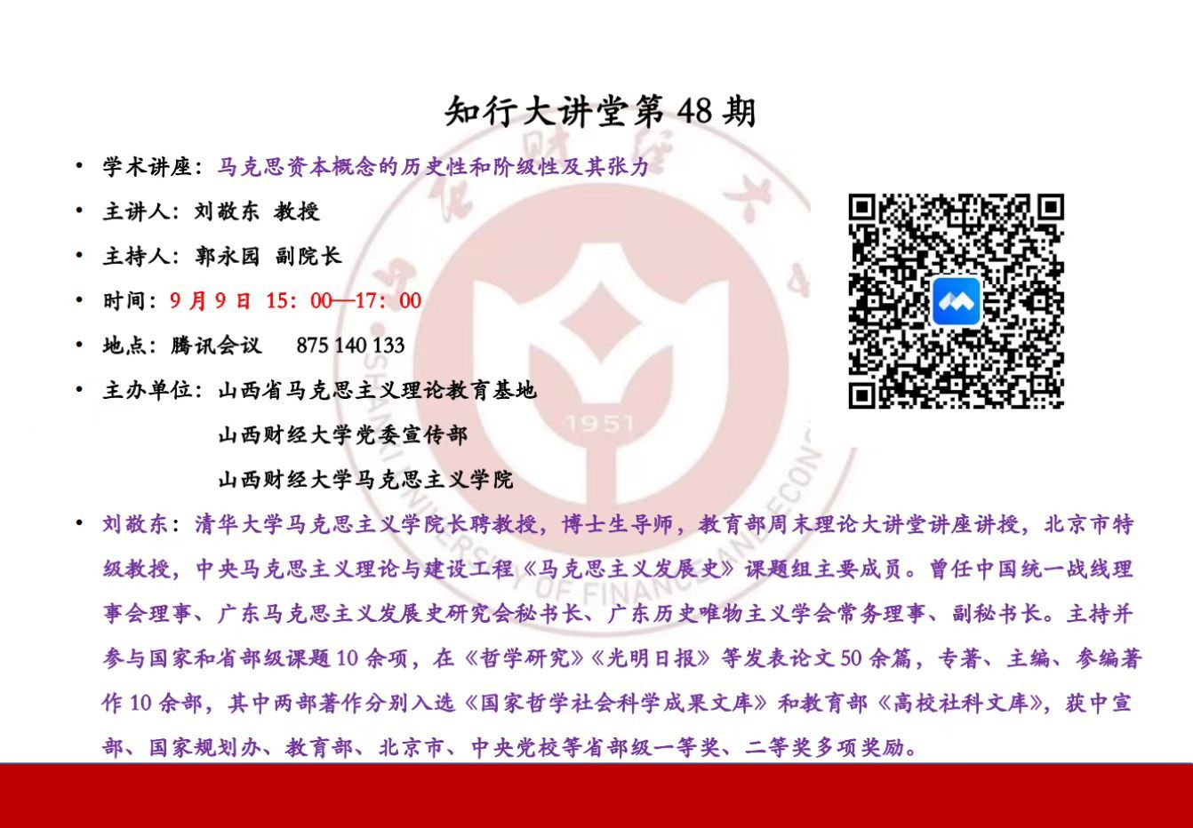 9月9日晚,由山西省马克思主义理论教育基地主办,党委宣传部、beat365唯一官网承办的知行大讲堂第48期以网络研讨会的形式顺利举行。中央马克思主义理论与建设工程专家、北京市特级教授、清华大学马克思主义学经理聘教授、博士生导师刘敬东教授作了题为《马克思资本概念的历史性和阶级性及其张力》的精彩报告。beat365唯一官网师生、思政工作骨干以及国内兄弟院校师生500余人通过腾讯网络研讨会参加此次学术讲座。讲座由beat365唯一官网副经理郭永园主持。