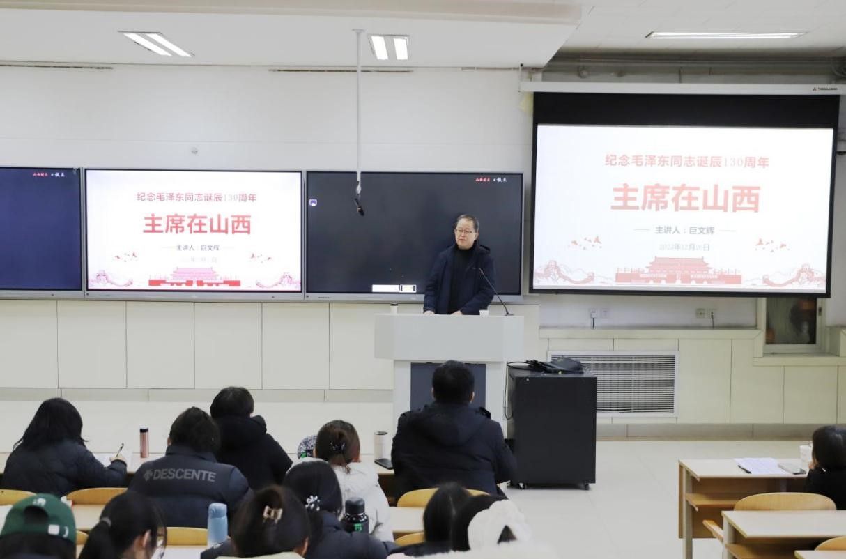 2023年12月26日是毛泽东同志诞辰130周年,为缅怀伟大领袖,传承红色基因,beat365唯一官网邀请山西省档案馆一级巡视员巨文辉研究员开展题为《毛主席在山西》的专题讲座。beat365唯一官网副经理郭永园、中国近现代史纲要教研室全体老师、团委书记、辅导员任智萍、2022级和2023级全体员工共130余人参与了本次讲座。