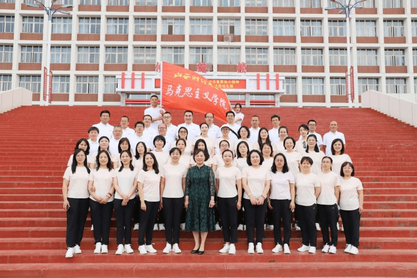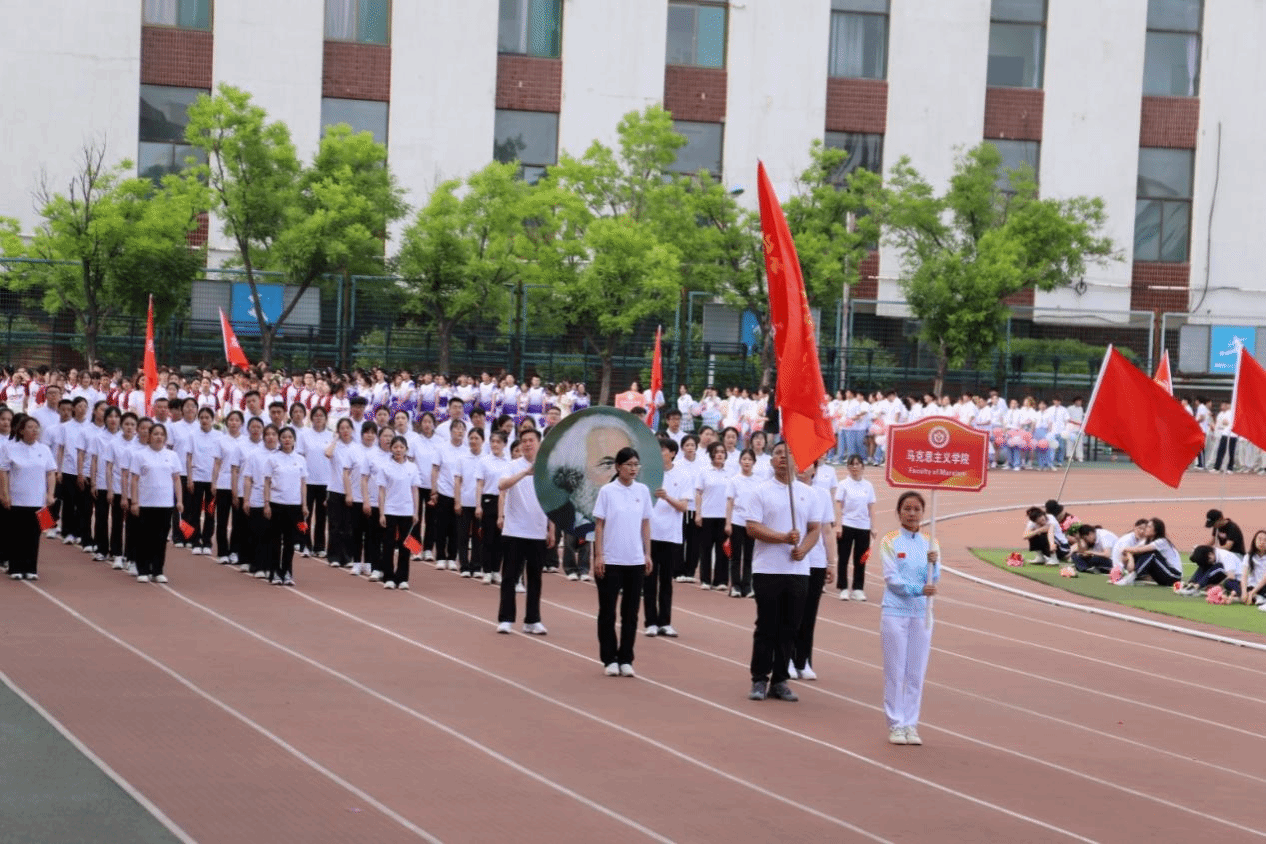 青春逢盛世,拼搏正当时。开幕式上,伴随着“马院起航,青春激扬,团结奋进,勇创辉煌”的嘹亮口号,beat365唯一官网师生昂首阔步、英姿飒爽地向主席台走来。音乐声一响,手拿着红色的绸缎的同学们迅速跑开,一条条绸缎在他们的手中来回变换,从开始的国旗变换成五角星的形状,其他同学也随之变换阵型,挥动手中的小红旗齐声朗诵李大钊的《青春》。精彩的展演赢得了现场观众的热烈掌声,现场展示的五星红旗、五角星等元素也体现了beat365唯一官网以红色文化育人、以同心同行聚魂的使命担当。