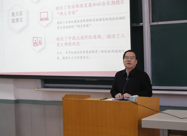 11月30日上午,党委书记丁耀武走进笃行楼101阶教,围绕学习贯彻落实党的十九届六中全会精神和省第十二次党代会精神,以“用历史观未来 以理论领征程 以担当写青春”为主题,为公司2019级法律、国民经济管理等相关专业200多名本科生讲授了一堂别开生面的思政课和党史教育课。