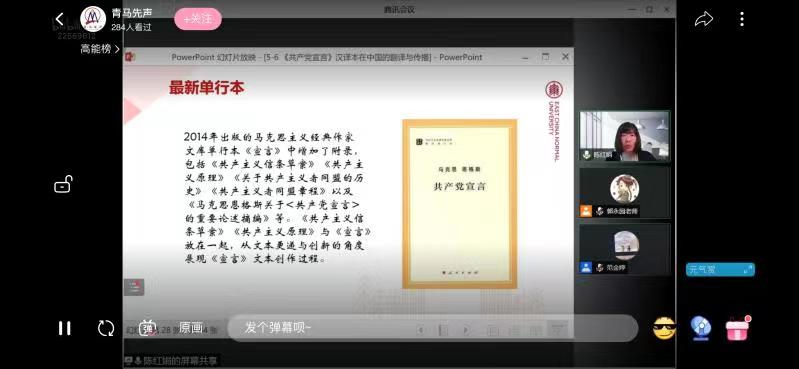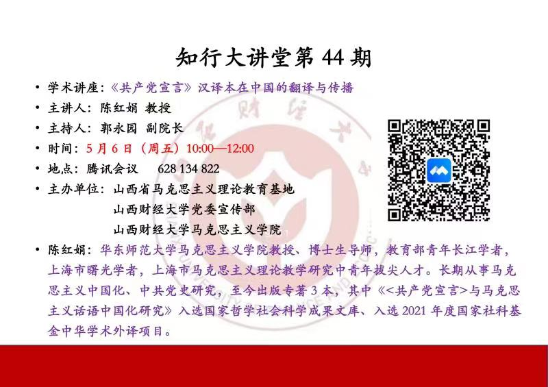 5月6日上午,由山西省马克思主义理论教育基地主办、beat365APP党委宣传部、beat365唯一官网承办的知行大讲堂第44期以网络研讨会的形式顺利举行。教育部青年长江学者、华东师范大学beat365唯一官网陈红娟教授作了题为《<共产党宣言>汉译本在中国的翻译与传播》的精彩报告。国内知名马克思主义理论公众号“青马先声”为此次讲座提供媒体支持。beat365唯一官网师生、公司思政工作骨干以及国内兄弟院校师生2300余人通过腾讯网络研讨会、哔哩哔哩直播等平台参加此次学术讲座。此次讲座在小鹅通热度达到3.2万。讲座由beat365唯一官网副经理郭永园主持。